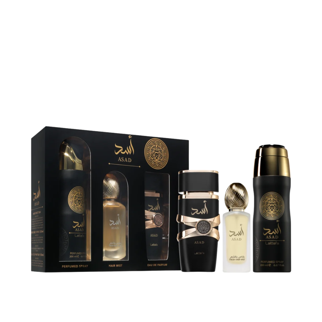 Intenso y carismático, el Lattafa Asad – Gift Set reúne todo para una rutina de aroma imponente. Su Eau de Parfum late en clave ámbar-especiada: apertura vibrante con especias cálidas, corazón aromático que aporta profundidad y un fondo vainilla-ámbar y maderas de gran fijación, perfecto para la noche y climas frescos. El estuche incluye el Eau de Parfum, Hair Mist para perfumar y cuidar el cabello sin resecar, y Perfumed Body Spray (200 ml) para reforzar la estela durante el día. Presentación negra con detalles dorados, lista para regalo. Úsalo en capas para máxima duración.