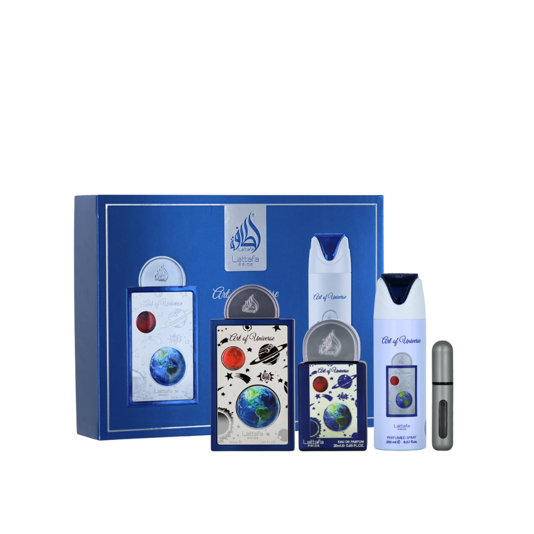 Explora nuevos horizontes con el Lattafa Pride – Art of Universe Gift Set. Un estuche azul espectacular que reúne todo para perfumarte en capas: Eau de Parfum de carácter contemporáneo (firma cítrica–aromática con acordes marinos sobre un fondo amaderado-ámbar de gran fijación), mini EDP para llevar contigo, Perfumed Body Spray (200 ml) y gel de ducha perfumado que potencian la estela, además de atomizador de viaje recargable. Fresco, versátil y con mucha personalidad, es perfecto para el día a día, el gym o una escapada de fin de semana. Presentación premium, lista para regalo.