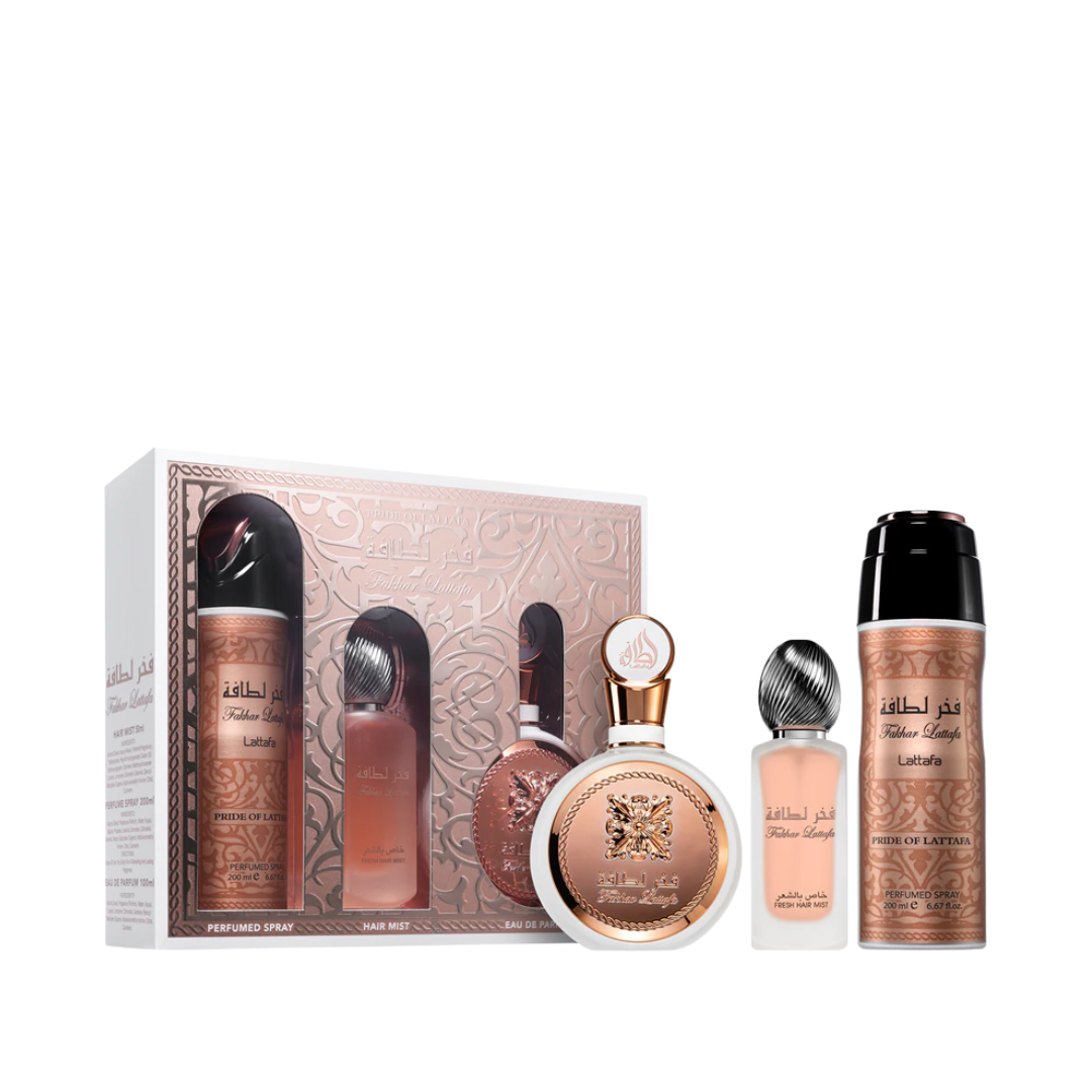 Opulento y radiante, el Lattafa Fakhar (Pride of Lattafa) – Gift Set viste de rosa dorado tu rutina de fragancia. Su Eau de Parfum es un floral-frutal adictivo: arranca con lichi, manzana verde y durazno, late en un corazón de jazmín, rosa y fresia, y se posa en un fondo vainilla–almizcle–sándalo con un toque de pachulí, dejando una estela cremosa, dulce y muy femenina, de gran fijación. El estuche incluye el EDP, Hair Mist para perfumar y cuidar el cabello sin resecar y Perfumed Body Spray (200 ml) para refrescar y reforzar la fragancia durante el día. Úsalo en capas para prolongar el aroma. Elegante presentación en relieve, lista para regalo.