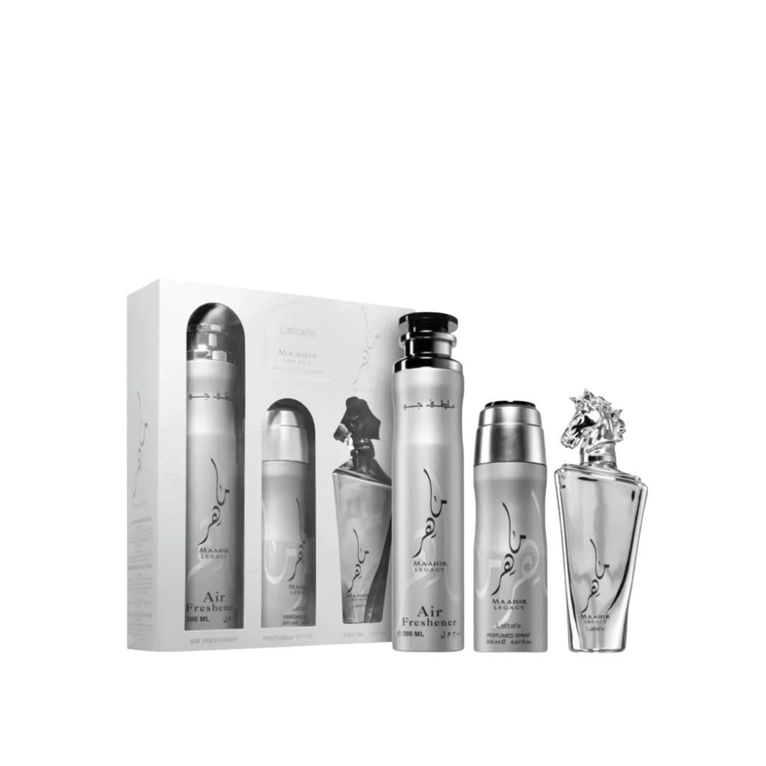 Elegante y con carácter, el Lattafa Maahir Legacy – Gift Set reúne todo para perfumarte en capas. Su Eau de Parfum desliza una firma cítrica–aromática con destellos frutales al inicio, un corazón limpio con matices especiados/herbales y un fondo amaderado–ámbar con suaves toques de almizcle que aporta proyección y gran fijación; perfecto para el día a día y también para la noche. El estuche incluye el EDP en su llamativo frasco con tapón de caballo, Perfumed Body Spray (200 ml) para refrescar y reforzar la estela durante el día y Air Freshener (300 ml) para perfumar tus espacios o textiles a juego. Presentación plata/negro de acabado premium, lista para regalo.