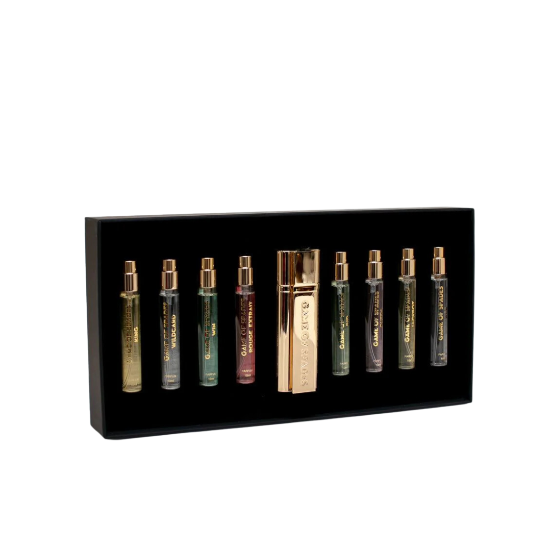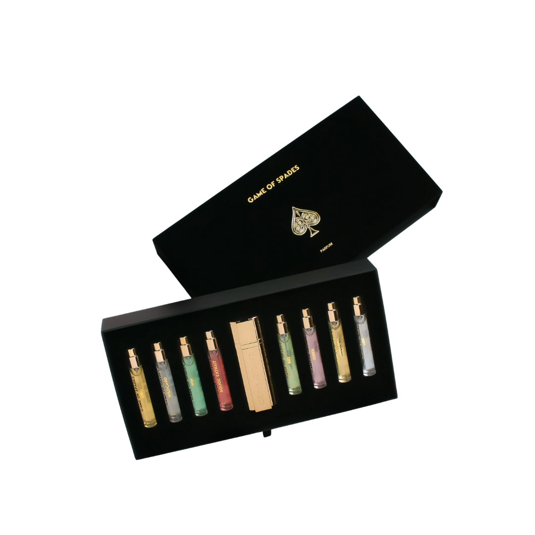 El Set Game of Spades es una colección exclusiva que presenta una selección de fragancias intensas y sofisticadas, ideal para quienes buscan variedad y exclusividad en su estilo. Este set incluye ocho mini perfumes cada uno diseñado para proyectar una personalidad única. Perfecto para experimentar diferentes aromas y encontrar el ideal para cada ocasión, el set viene en un lujoso estuche negro con detalles dorados, haciendo de esta colección un regalo excepcional para los amantes de la perfumería de alta gama.